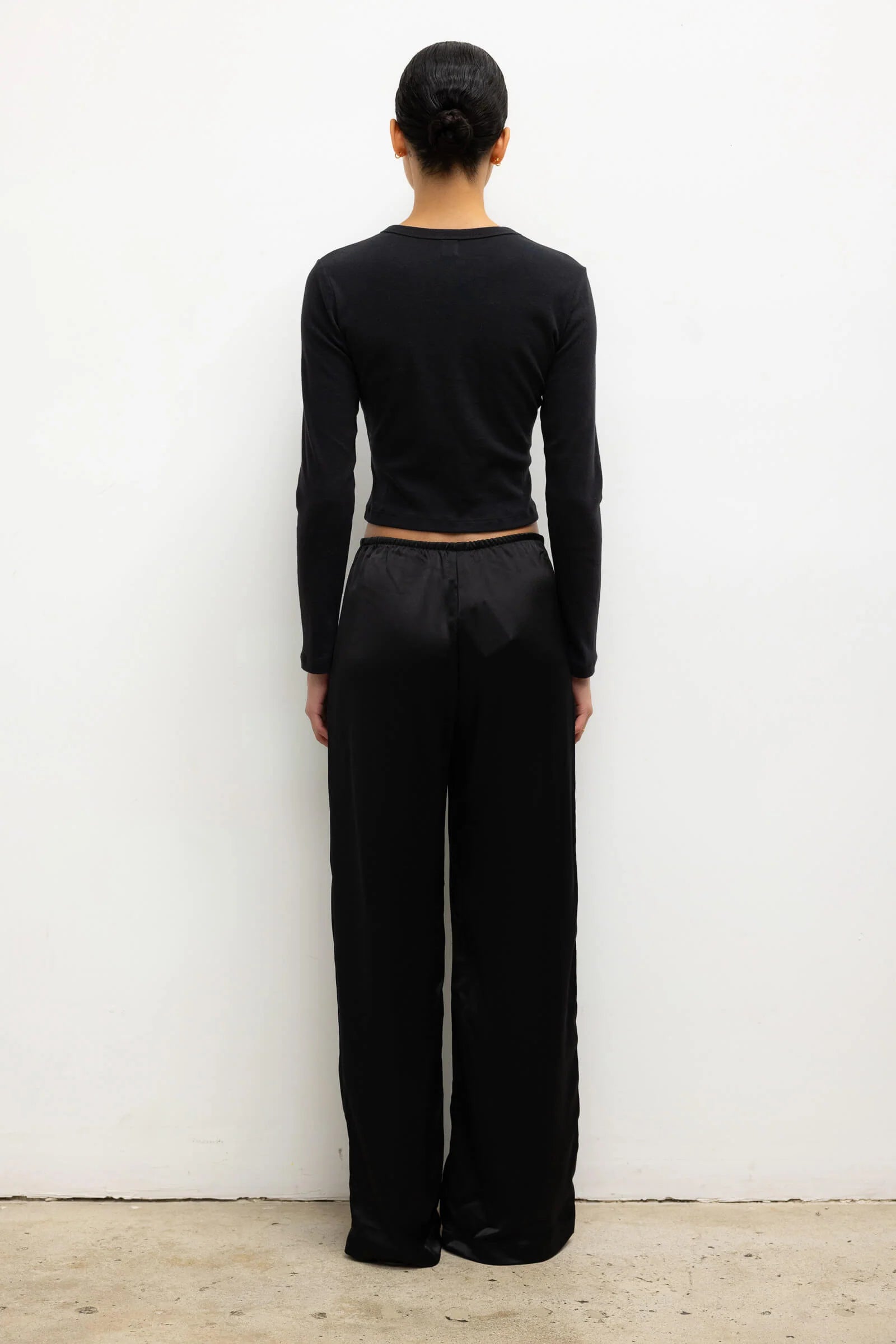 Cut in Japanese-crafted satin, The Barb Wide Leg Pant is the bestselling option for everyday elegance. This easy pull-on silhouette features a thin elastic mid-rise waistband and a relaxed, perfectly draped wide leg.