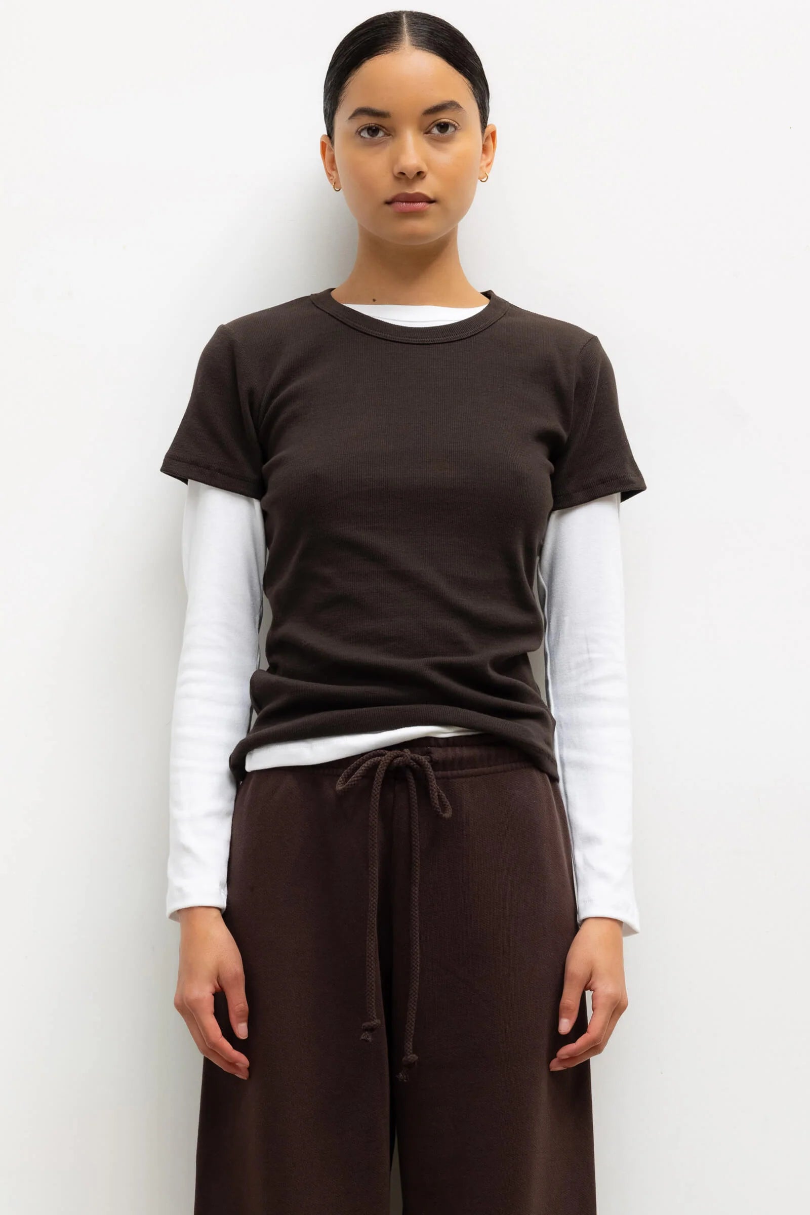 Cut in our anything but basic Kelly Cotton Rib, The Kelly Slim Fit Tee is a close-fitting silhouette finished with a crew neckline and fitted short sleeves. Mix it monochromatically with The Jamie Set in Chocolate.
