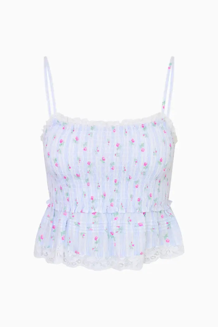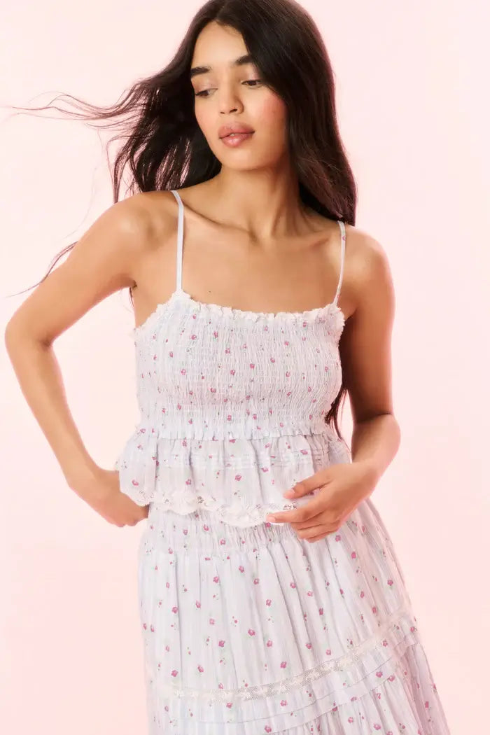 The Marzenia Top returns for the season with a striped cotton voile fabric featuring a ditsy floral print all over. This Victorian-inspired piece features textured stripes, a smocked bodice to the empire waist and a charming flutter peplum adorned with lace trims and delicate tucking. Adjustable spaghetti straps ensure a perfect fit, making it ideal for pairing with skirts or denim for both casual and elegant occasions.