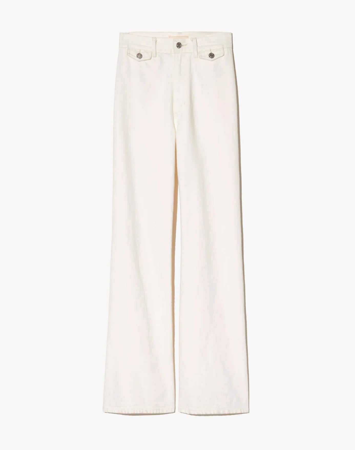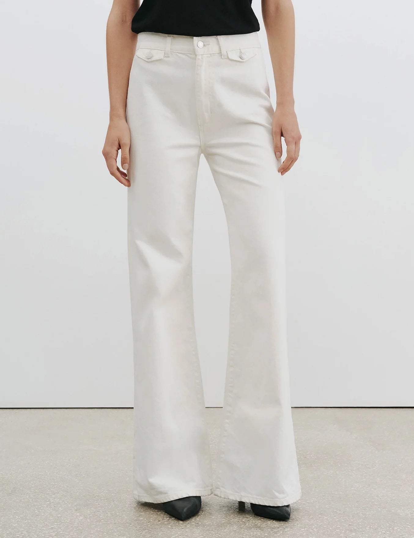 The Edira Jean offers a modern take on classic denim tailoring. Crafted in the USA from premium Japanese non-stretch denim, this high-rise silhouette features a structured flare leg and refined construction for a timeless, elongating look. Front shank pocket detailing, darted back patch pockets, and a clean waistband with belt loops lend a sophisticated finish to this elevated everyday essential.