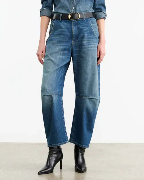 Mid-rise, relaxed fit barrel leg jean in Japanese stretch denim. Uniquely curved silhouette. Seam at knees. Gusset at inseam. Zip fly. Shank closure. Front slash pockets. Top-stitched back patch pockets. Belt loops.