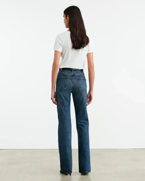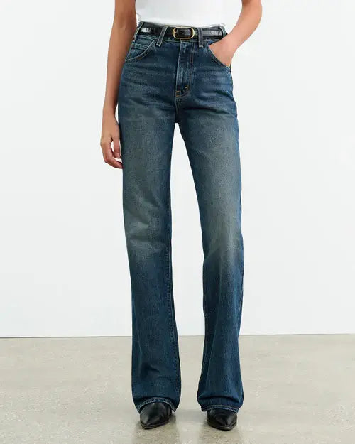 High-rise straight leg jean in non-stretch Japanese heavyweight crosshatch denim. Fitted through waist and hips. Five pocket details. Zip fly. Shank closure. Belt loops.