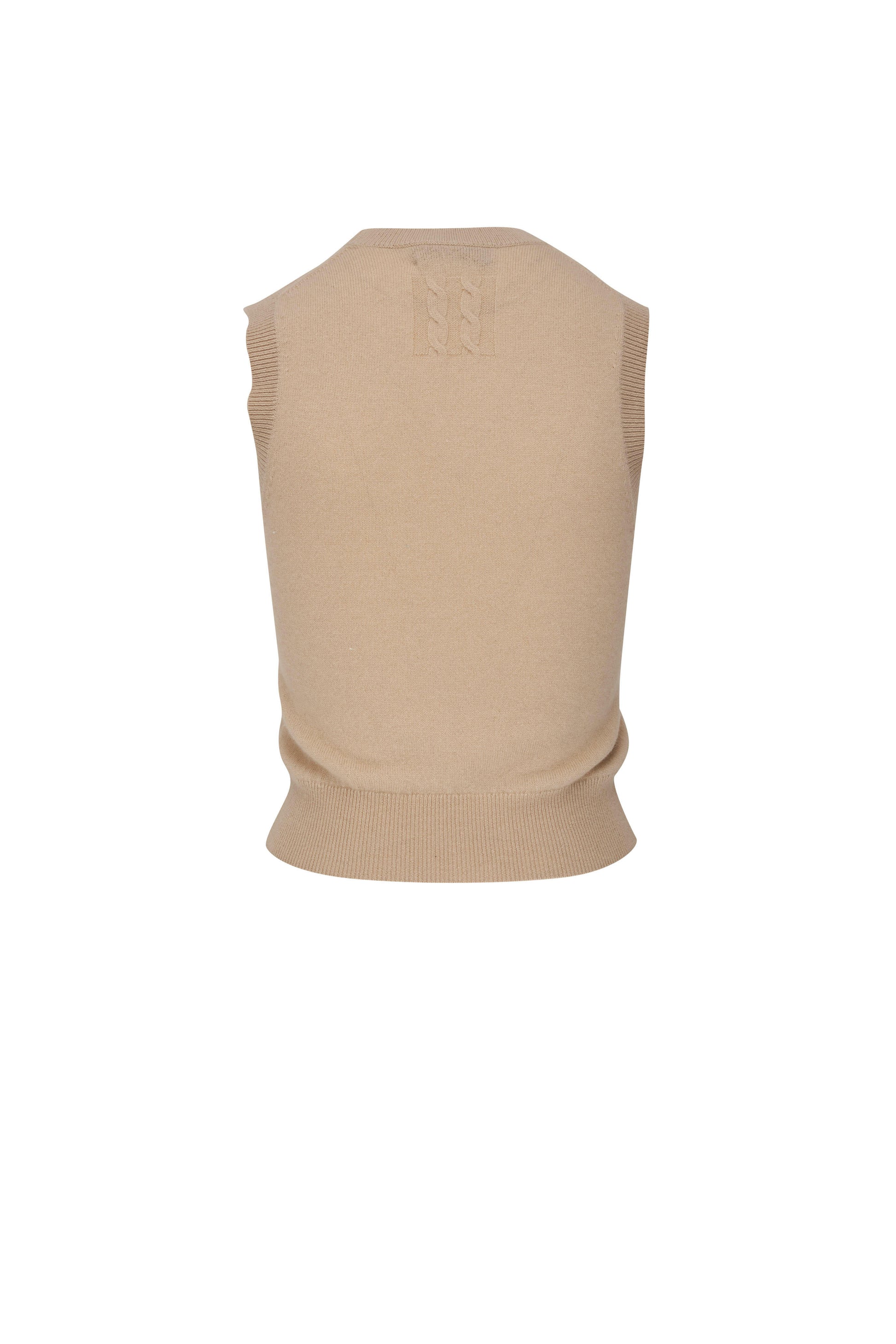 Light to medium weight cardigan. Six button center front closure. Fully fashioned along neck, sleeve and arm hole. Center back signature cable knit detail.