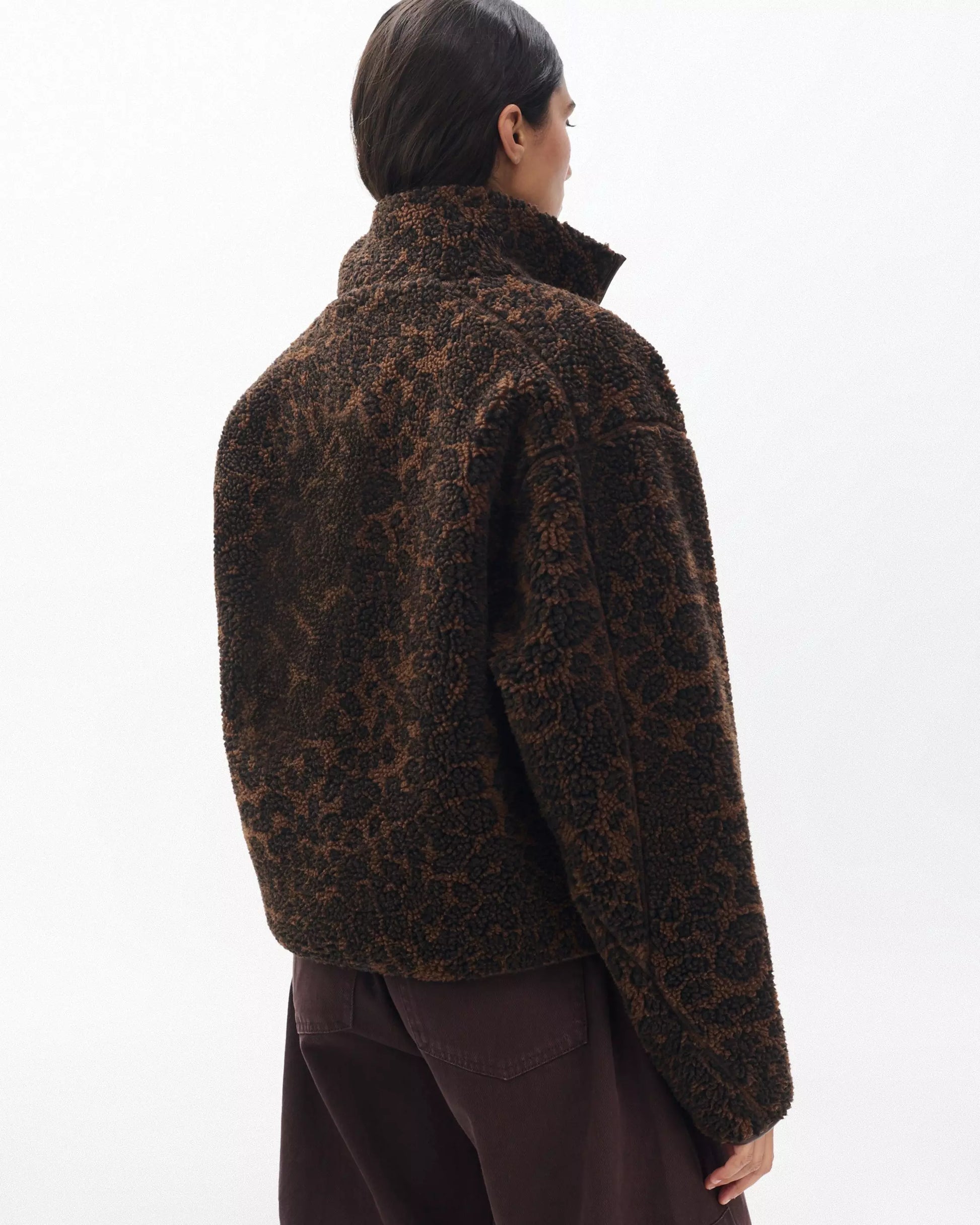 Statement style. This high-neck jacket is crafted from plush sherpa with the season's leopard print. Tonal faux leather binding hides the zipper for a clean, elevated look when zipped. Falling at the hip, it's the perfect cozy yet chic layer to pair casually with denim or dress up with a skirt, tights, and boots.
