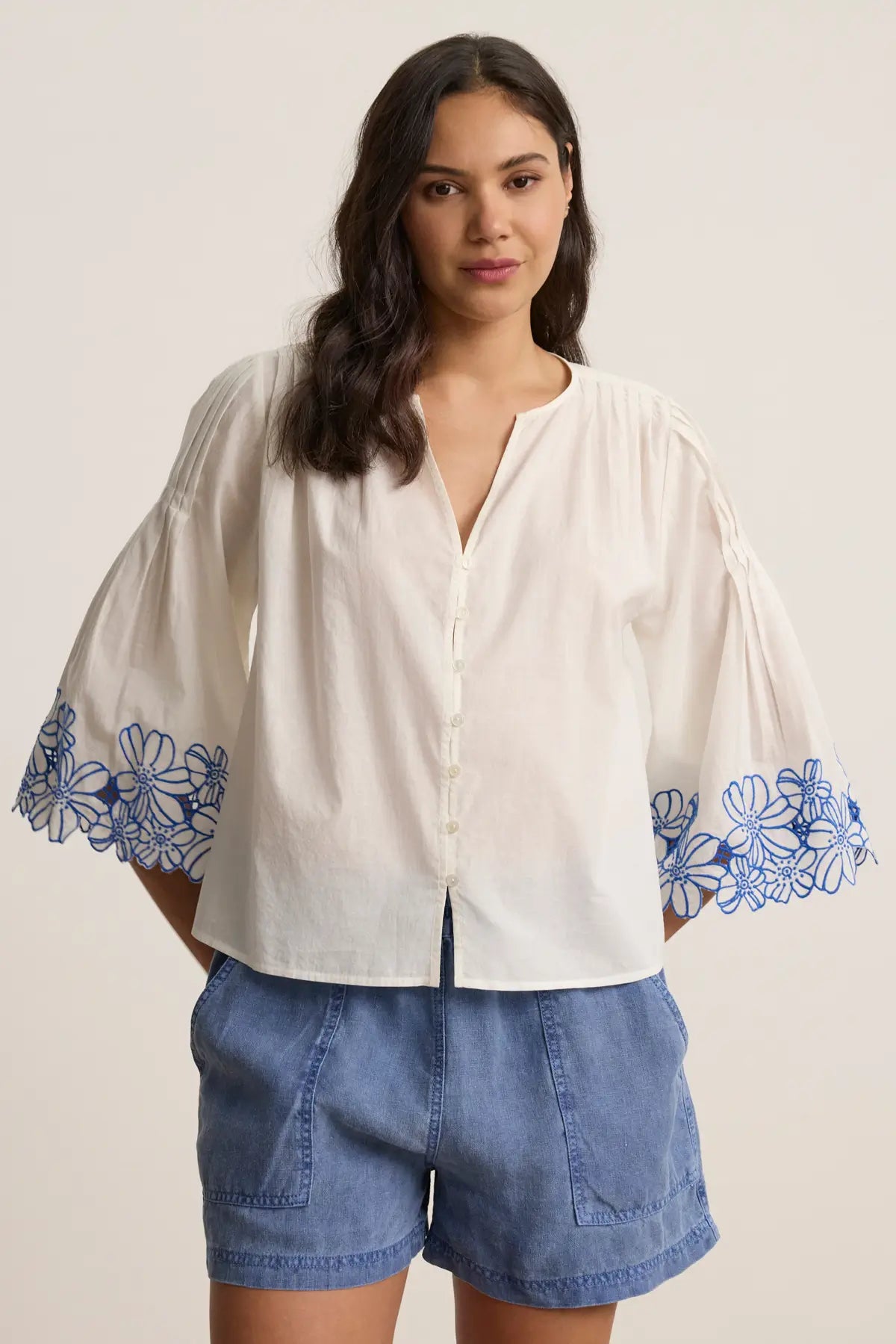 The Blake Top in Cream Cobalt by Velvet is a breezy button-down blouse with a swingy silhouette and standout embroidered sleeves. The soft cotton voile body is balanced by wide, elbow-length sleeves detailed with bold cobalt floral embroidery and scalloped edges. An easy pick for warm days with a hint of artisanal flair.